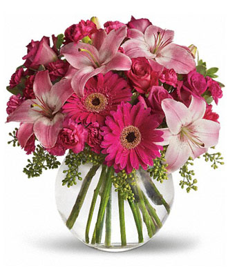 This bouquet's pink splendor uniquely conveys your feelings when words alone can't capture your adoration. Asiatic lilies and mini carnations encircle stunning pink roses, forming an energetic floral display. The inclusion of gerberas and full-sized carnations in various pink shades culminates in a dazzling presentation of pink beauty. A hint of greenery not only enhances the vibrancy but also elevates the arrangement's magnificence with a striking contrast against the profusion of pink.