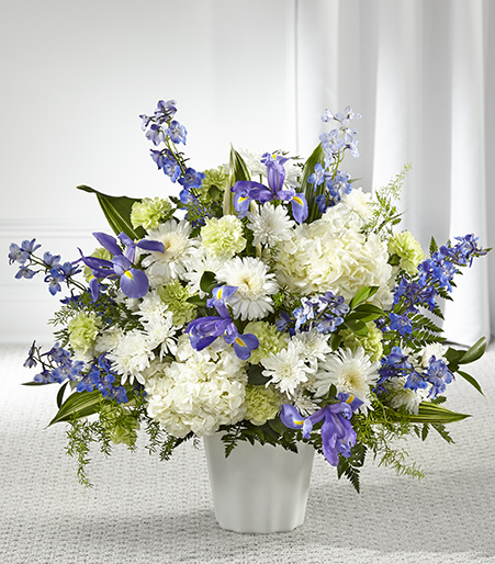 Our local florist understands the importance of creating a tribute that brings peace and comfort to your loved one. That's why we've created the Soft Serenity Floor Basket, a stunning arrangement of blue and white flowers. The combination of iris, hydrangea, delphinium, and cremon mums creates a fresh and serene atmosphere, reminding your loved one of your care and support during this difficult time.