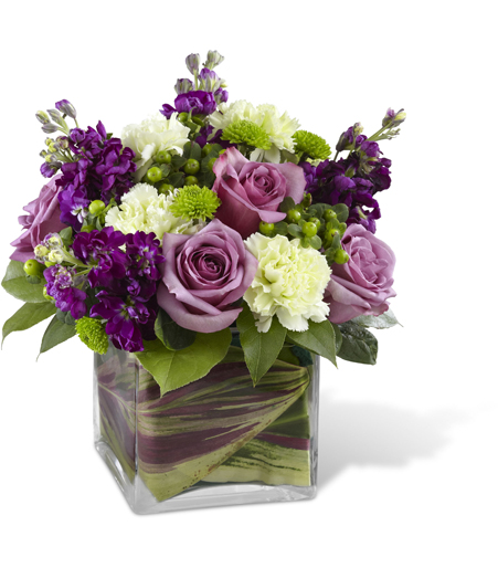 This exquisite display of purple and green flowers will leave your loved one spellbound by its beauty and the emotions each blossom portrays. The soft hues of lavender roses and green carnations perfectly complement the deeper tones of purple stock, green hypericum berries, and button poms, creating a celestial and refined assortment of blooms.